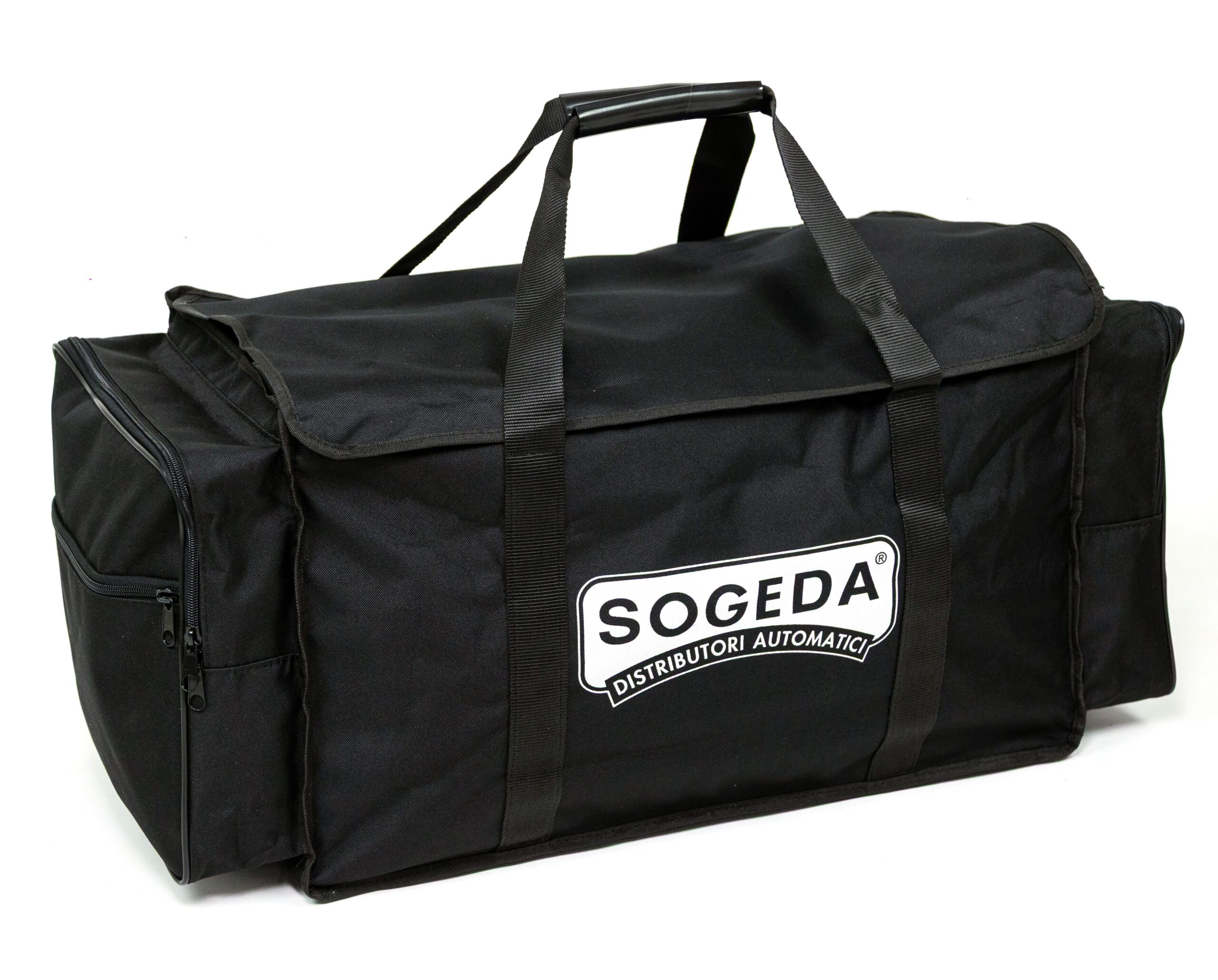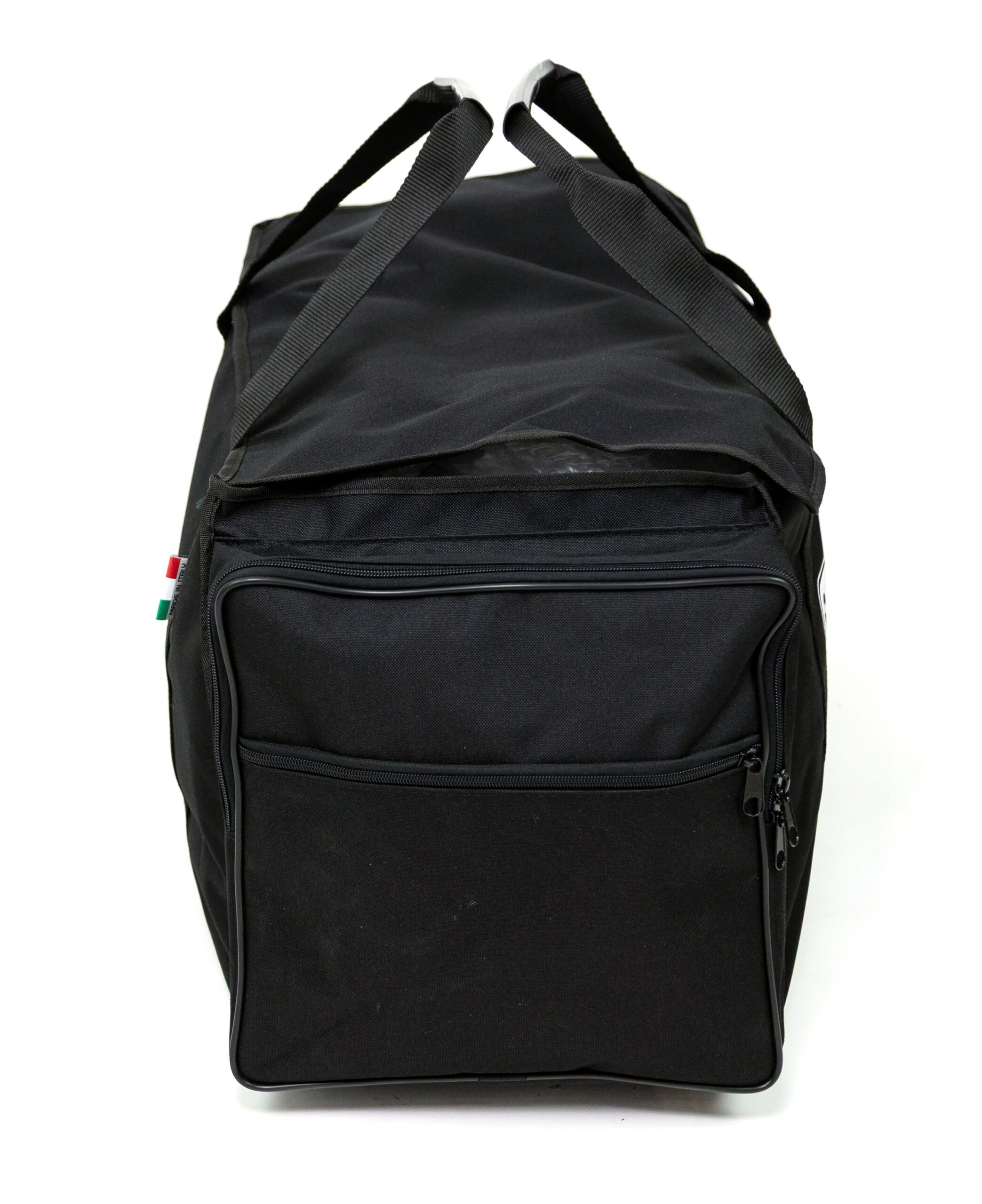 Borsone morbido dalle ampie dimensioni, piedini d’appoggio, munita di due manici con maniglie ergonomiche, uno scomparto principale con patta di apertura su 3 lati con chiusura con velcro; due tasche laterali più un taschino piatto con zip. Avendo soltanto una basetta rigida sul fondo la borsa può essere facilmente piegata su se stessa per occupare meno spazio.