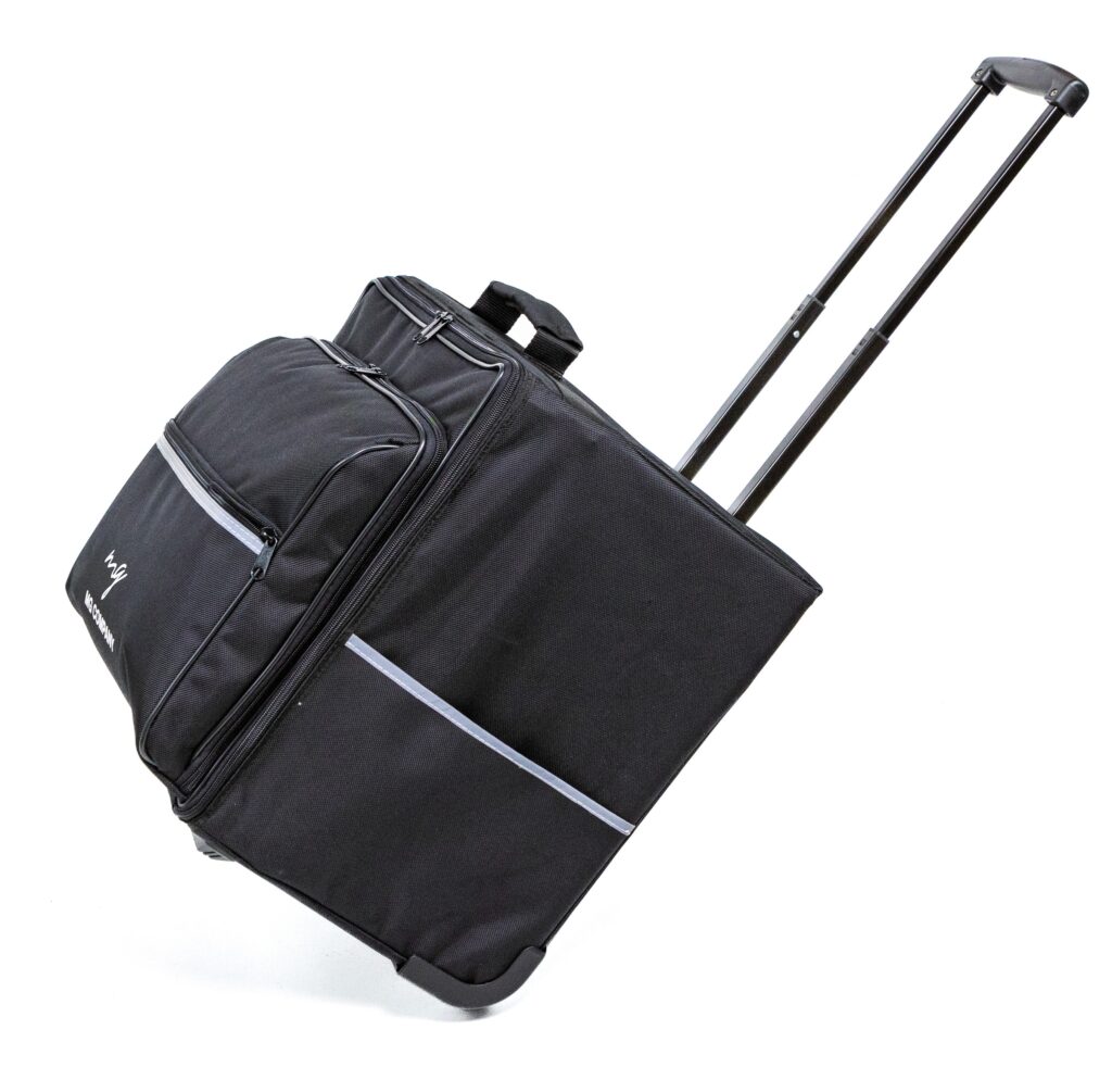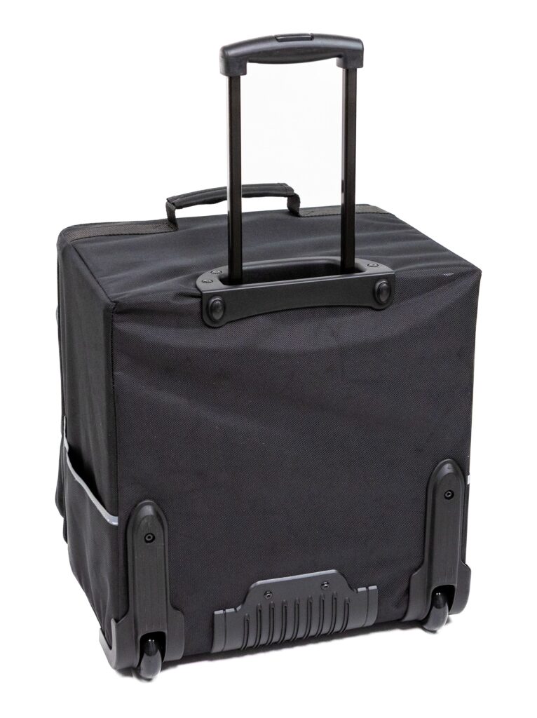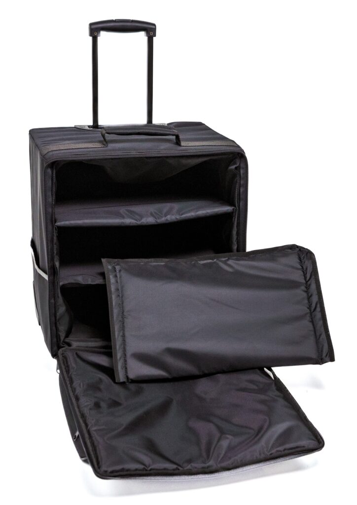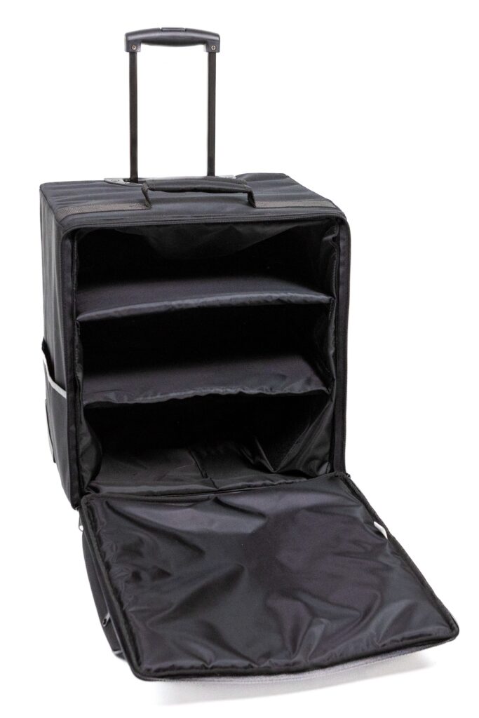 Trolley compatto ideale per l’uso quotidiano e per il trasporto di piccoli campionari, raccoglitori ed oggetti poco voluminosi in generale. Dotato di un vano principale nel quale possono essere aggiunti dei separatori (su misura), una capiente tasca esterna con un’ulteriore taschina piatta con zip e altre 2 piatte sui fianchi. Costruito con un robusto meccanismo telescopico, ruote che garantiscono la protezione laterale e degli scalini ed un bumper che ne rinforza la base.